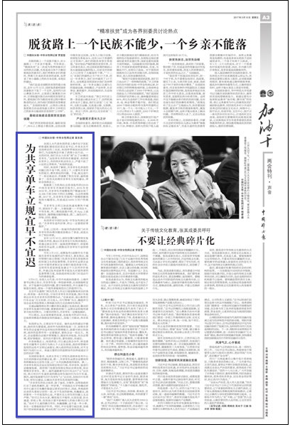 同时,朱国萍了解到,共享单车乱停放的问题已经不是个例,全国上下,只要有共享单车的地方,都有类似的问题。于是,她又进行了一些实地走访,并请教了相关专家,最终准备了一份有关治理共享单车方面的建议,带到全国两会上。