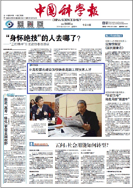 【两会·天大声音】中国科学报头版:9高校联名建议加快培养高端工程技术人才