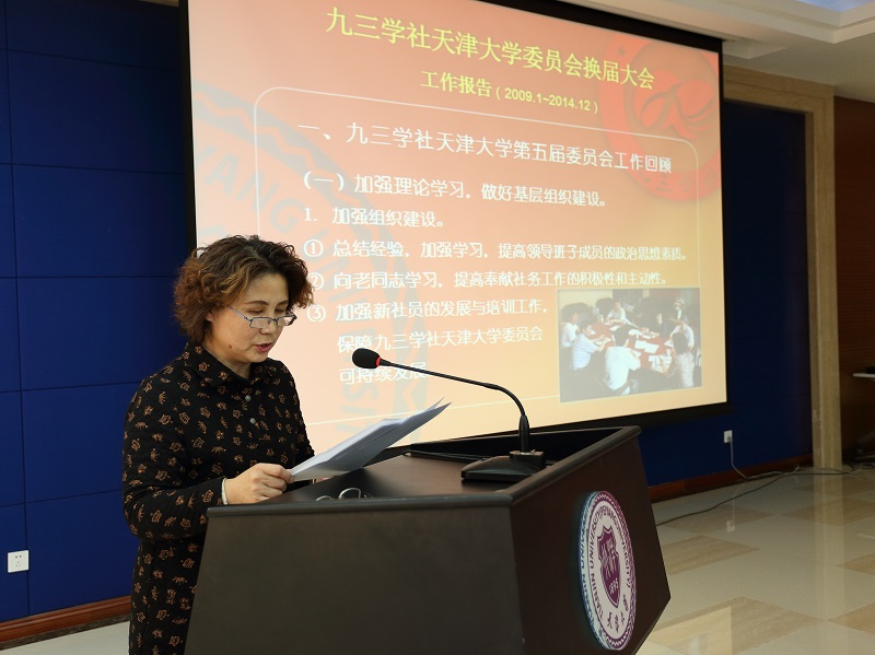 本站讯(通讯员 杨静)2014年12月19日,九三学社天津大学第五届委员会召开社员代表大会进行换届选举。九三学社天津市委员会副主任委员张凤宝、组织部副部长董知之、监督委员会委员李少恩,天津大学党委常委、组织部长兼统战部长马春有、统战部副部长康丽琼,农工党天津大学委员会主任委员姚琲、致公党天津大学总支委员会主任委员王宇新、民进天津大学委员会常务副主任委员何明霞、民盟天津大学委员会委员刘正先、民建天津大学支部委员关静以及杨恩泽、严宗达、王明时、涂光备等40余位社员代表参加会议。民进天津大学委员会常务副主任委员何明霞教授代表各民主党派天津大学基层组织宣读了贺信。