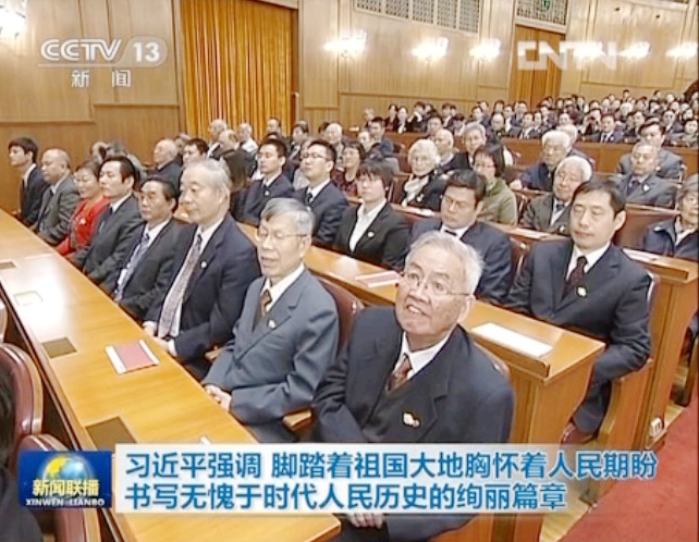 我校代表参加欧美同学会100周年大会《新闻联播》截图。前排右起张国雄、王先来、唐志远,左二孙济洲