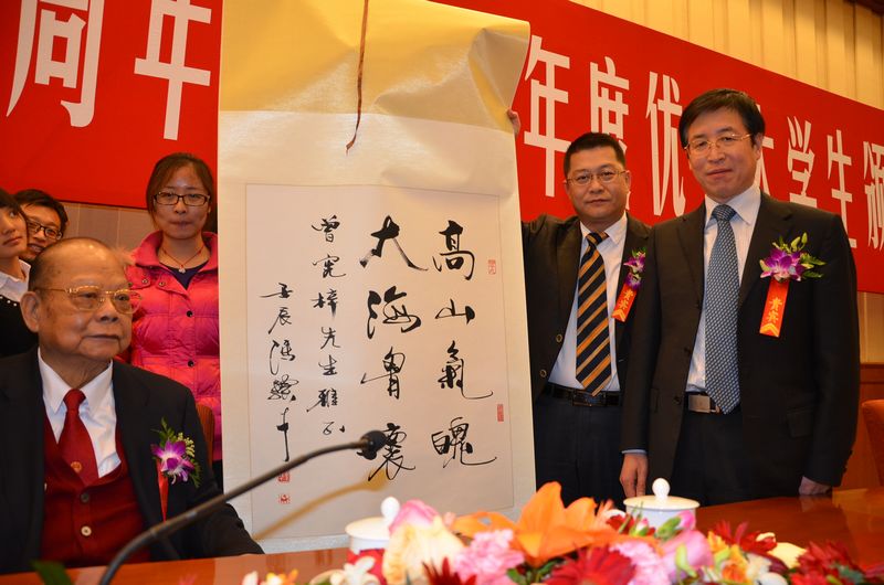 本站讯(通讯员 周艳)12月20日,曾宪梓教育基金会成立二十周年暨2012年度优秀大学生颁奖大会在北京人民大会堂举行。天津大学校长李家俊、副书记李义丹出席大会。校友与基金事务处长李秀民、两办主任肖松山、两办副主任赵欣、学工部副部长肖述虎及获奖学生代表等10余名师生参加大会。李家俊、李义丹代表学校接受曾宪梓先生1000万元港币捐赠,并回赠我校冯骥才教授题字“高山气魄 大海胸怀”。该笔捐款将定向用于支持我校校园基本建设。