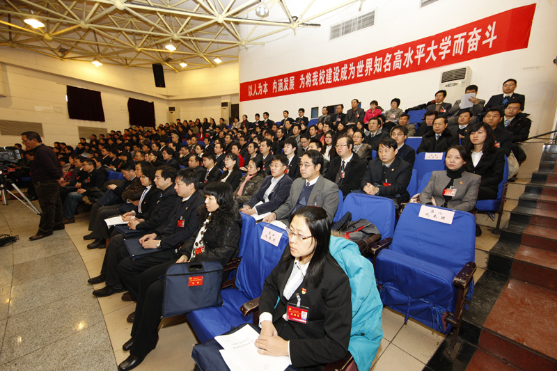 大会现场雄伟庄严,气氛热烈。主席台上方悬挂着“中国共产党天津大学第九次党员代表大会”的横幅,后幕正中是镰刀和锤头组成的党徽,10面鲜艳的红旗分列两侧。报告厅后方悬挂着“以人为本 内涵发展 为将我校建设成为世界知名高水平大学而奋斗”的横幅。
