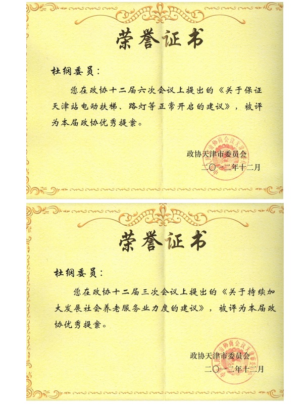 天津市政协委员、天津大学经管学部教授杜纲在天津市十二届政协三次会议上递交的《关于持续加大发展社会养老服务业力度的建议》和十二届政协六次会议上递交的《关于保证天津站电动扶梯和路灯等正常开启的建议》均被采纳并被评为本届政协优秀提案。