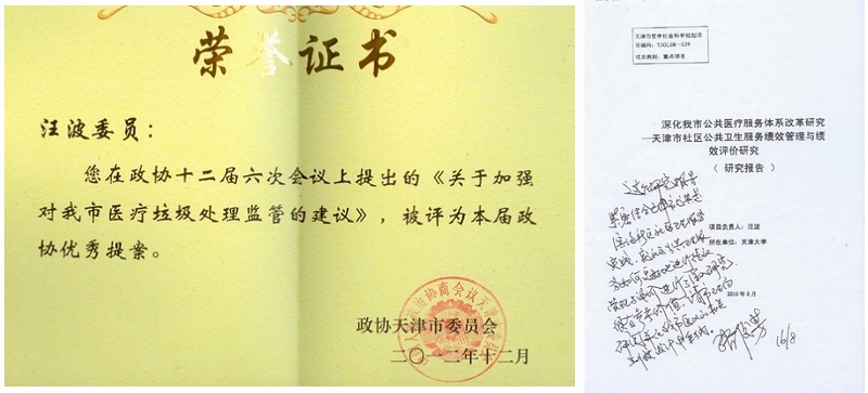 天津市政协常委、市政府参事、天津大学经管学部教授汪波在天津市十二届政协六次会议上递交的《关于加强对我市医疗垃圾处理监管的建议》被采纳,并评为本届政协优秀提案。另外,汪波关于《深化我市公共医疗服务体系改革研究》的研究报告得到副市长张俊芳的批示“这个研究报告紧密结合我市尤其是滨海新区社区卫生服务实践,就社区公共卫生服务如何更好地进行绩效管理与评价进行了深入研究,很有参考价值,请卫生局研阅并在我市医改的机关制度设计中采纳”。