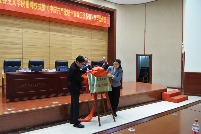 (撰稿 李莉)3月25日下午,天津大学社会主义学院揭牌仪式暨《中国共产党统一战线工作条例》学习培训班开班仪式在卫津路校区科学图书馆二层报告厅举行。天津市政协委员、市政协民族宗教专门委员会原主任、市社会主义学院原党组书记王竞,天津市教育工作委员会统战处处长祝建,天津大学党委副书记赵美蓉,天津大学党委常委、校长助理、统战部部长张力新等出席揭牌仪式。党委统战部副部长康丽琼主持仪式。